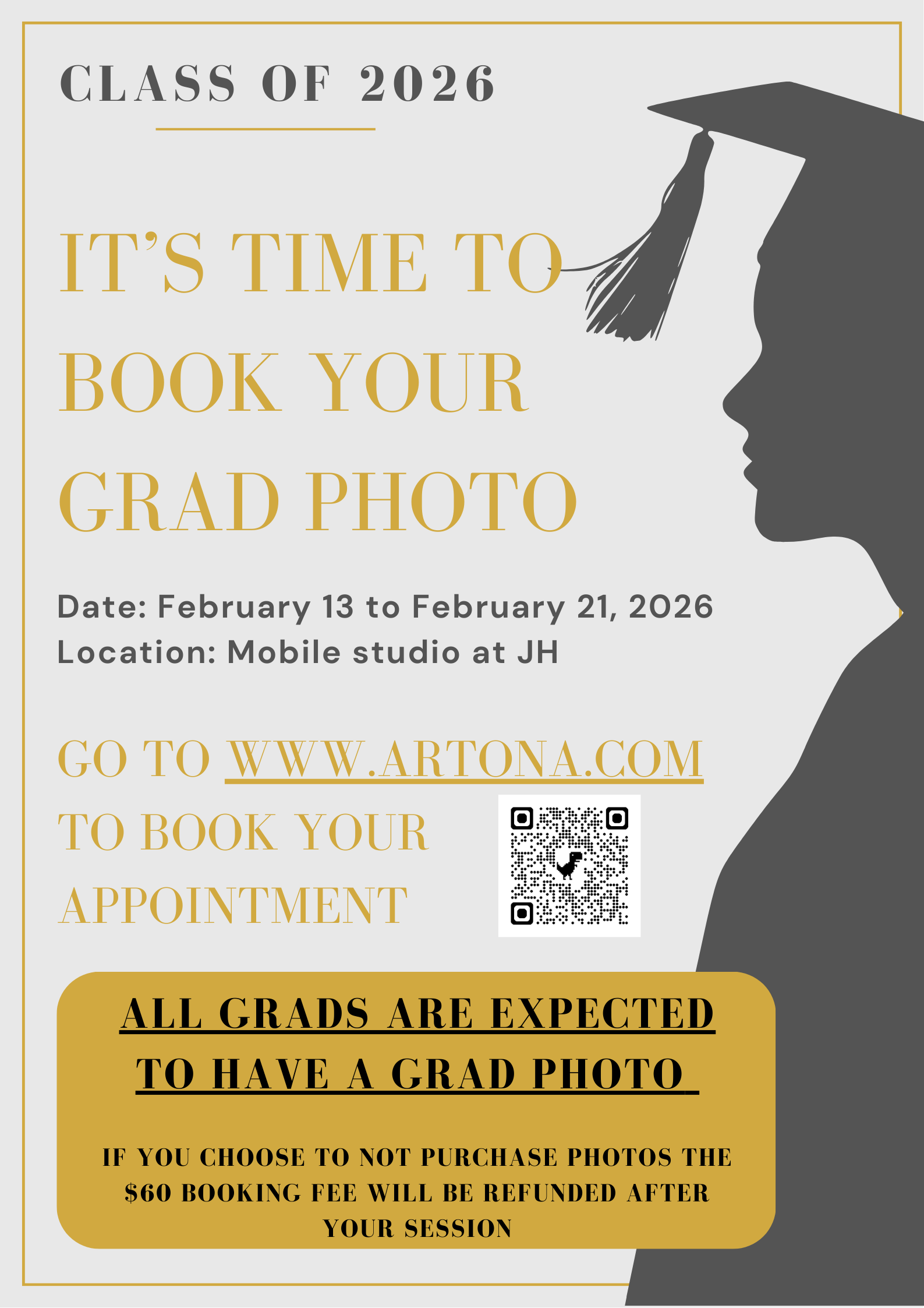 Graduation photo sessions will be held from February 13 to February 21. All graduating students are required to book a photo appointment, regardless of whether they intend to purchase photo packages.