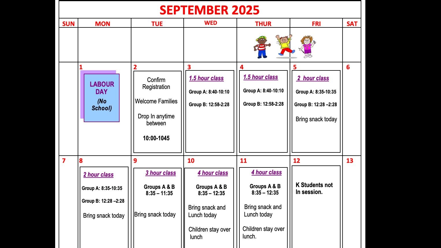 Grades 1-7: School starts on Sept. 2, 2025 at 10am. Classes will be dismissed early at 11am. Please see map of meeting locations below.