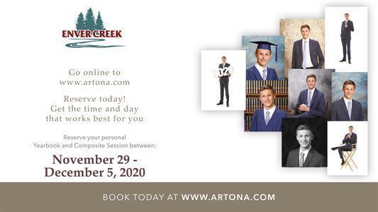 All Grad Photo mobile studio timeslots at Enver Creek are now fully booked.    Students who have not yet scheduled an appointment will need to visit https://artona.com and click on  the "Chat with Us" window to arrange an appointment at another location.  There is still a reasonable amount of availability at some of our neighbouring secondary schools in the coming weeks.   Alternatively,  students can book an appointment at the Artona Studios in Vancouver.  All graduating students must be photographed prior to December 31st to be included in our Grad Yearbook and wall composite.