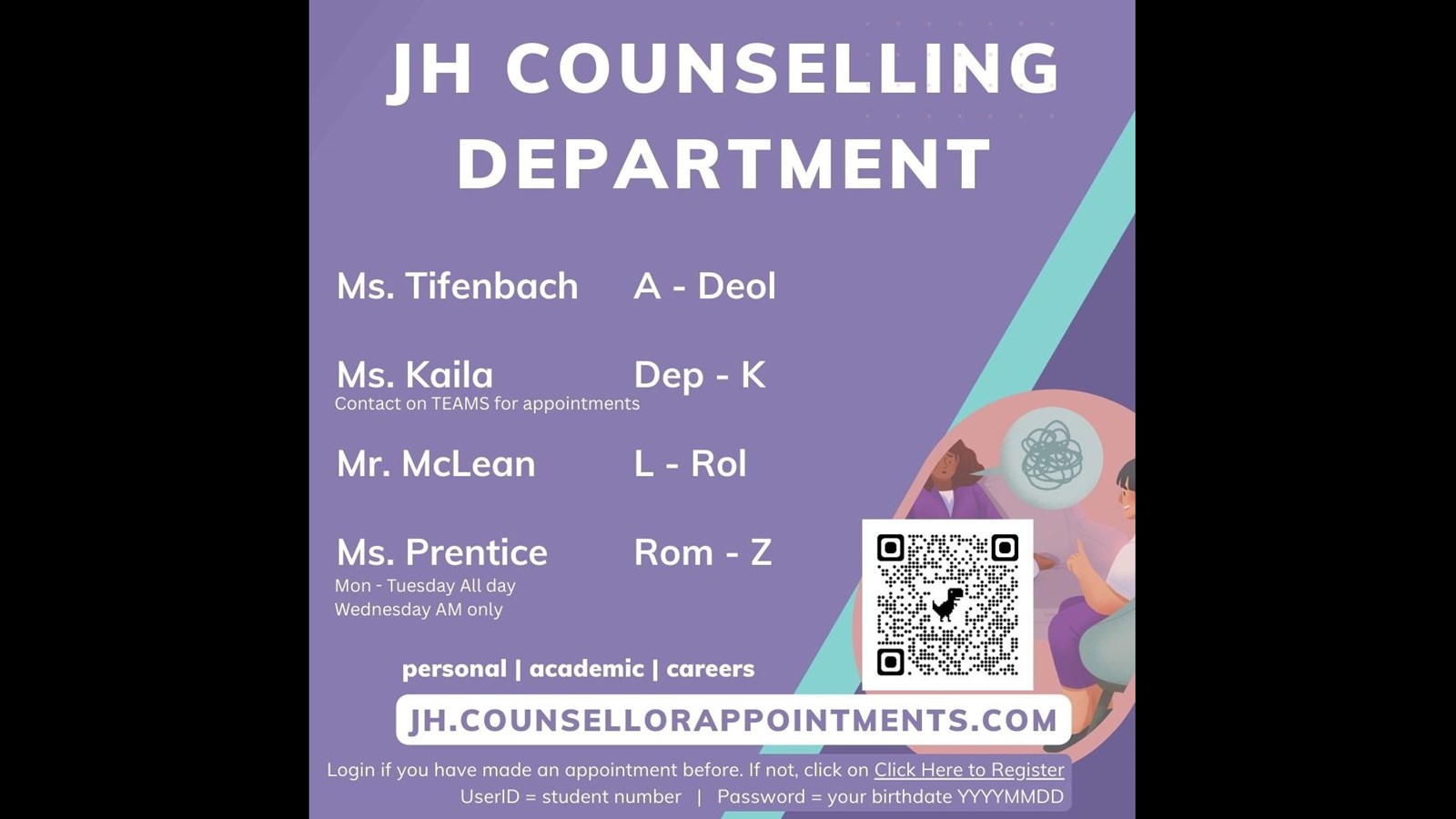 Parents are encouraged to contact their child's counsellor anytime regarding courses, post-secondary, attendance or any other student related issues but please make an appointment to ensure we have time to discuss these issues.