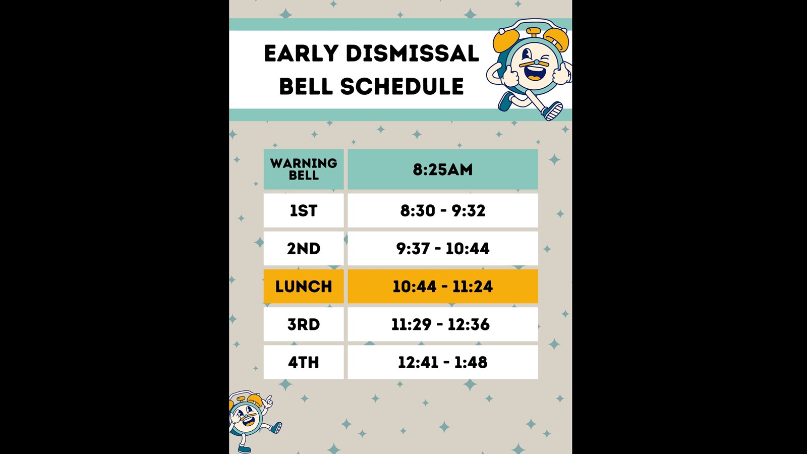 Thursday Feb. 26th is early dismissal, students will be dismissed at 1:48pm.