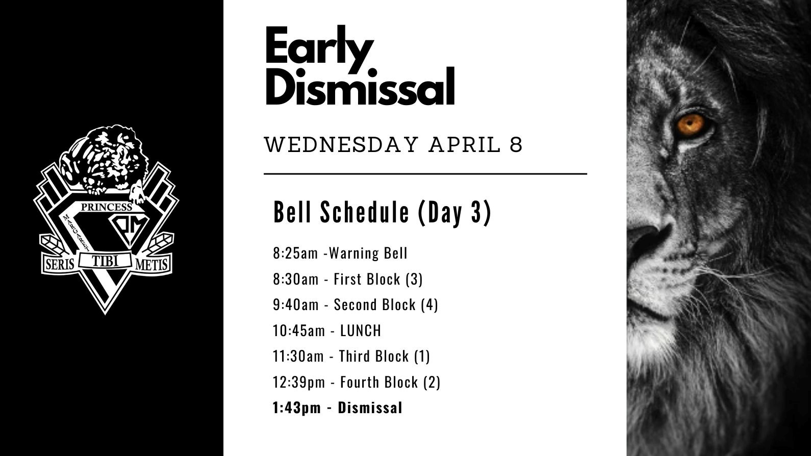 Please be advised that Wednesday April 8th is an early dismissal day. Classes will be dismissed at 1:43pm.