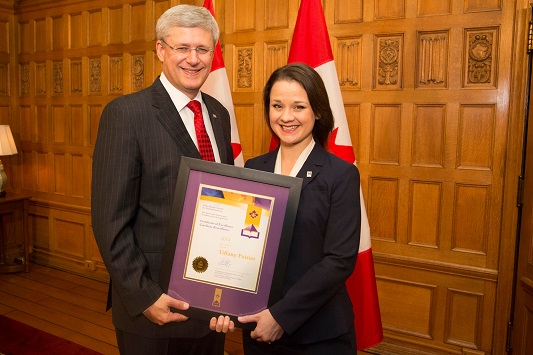 (Prime Minister Stephen Harper presents Surrey Schools teacher Tiffany Poirier with her Certificate of Excellence)