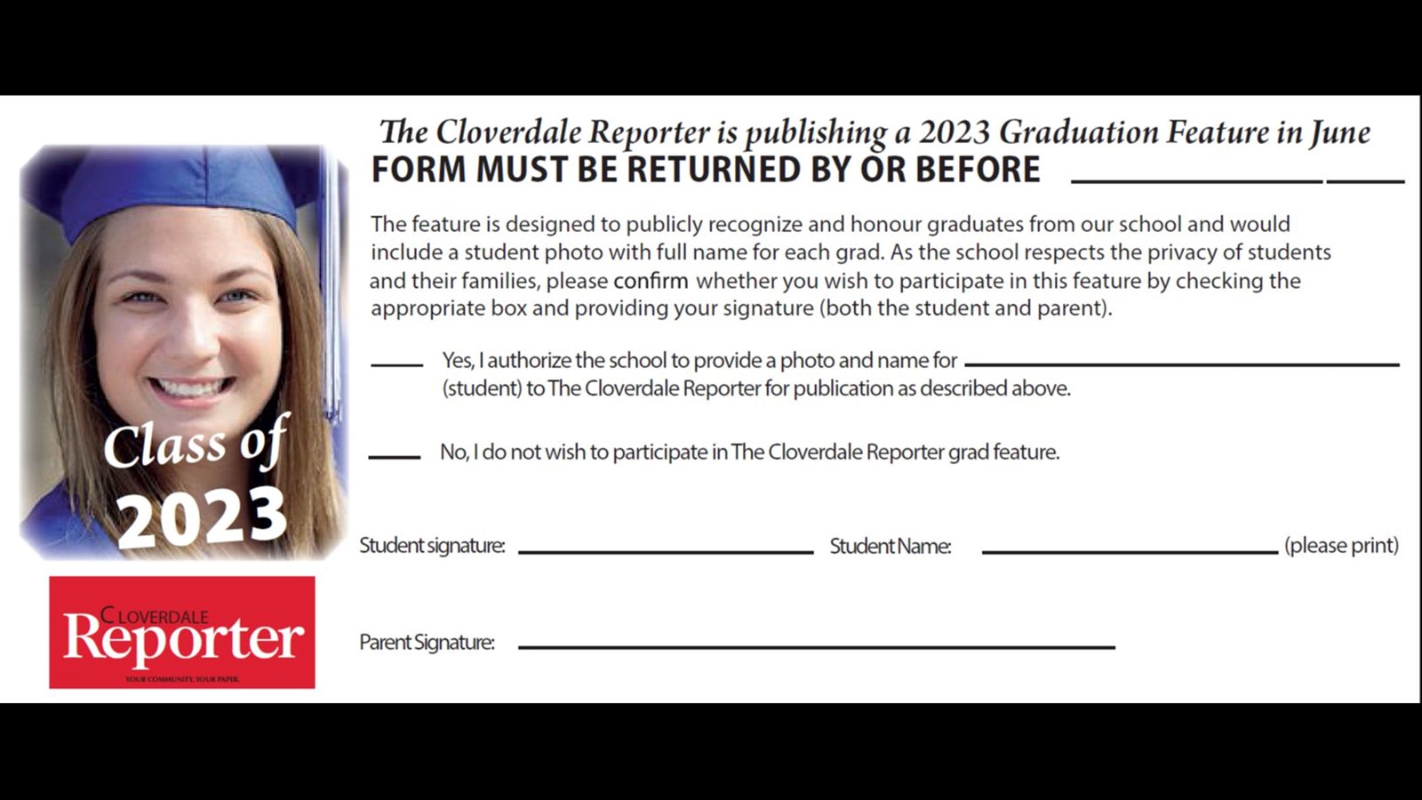 Attention Grads: Cloverdale Reporter Deadline fast approaching