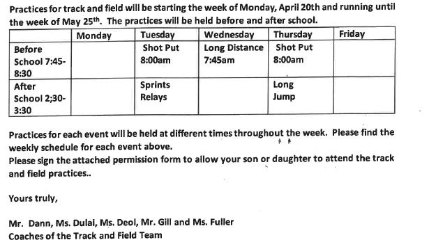 Track and Field has begun at T.E. Scott. Practice events and times are also listed on our T.E. Scott calendar.